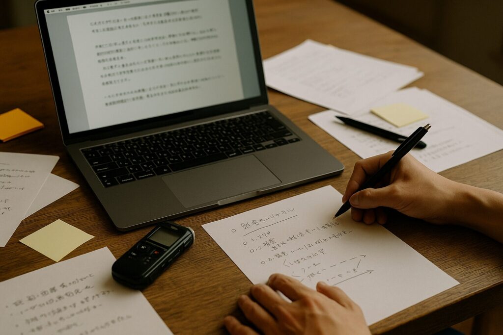 ここでは、録音データを文字にするだけでなく、「素材をどう整理し、構成に落とし込むか」がポイントになります。単に話した順に並べても、読者にとってわかりやすい記事にはなりません。