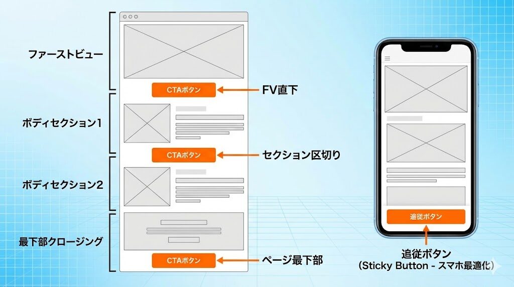 - 追従ボタン(スマホ最適化)スマートフォンでは、スクロールしても常に画面下部にボタンが表示される「追従型CTA」を設置することで、機会損失を大幅に防げます。