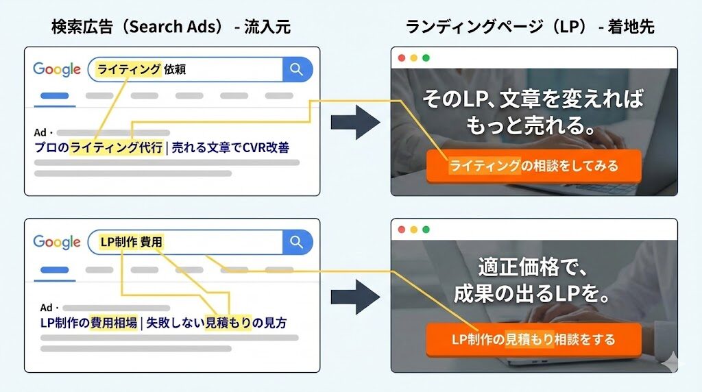 流入前のユーザーのモチベーションと、着地したLPの出口(ボタン)の言葉を一貫させることで、「求めていたものがここにある」と確信させ、迷わずクリックさせることができます。