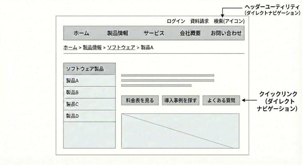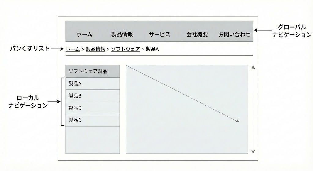 - グローバルナビゲーション:全ページ共通。サイトの主要なカテゴリを示します。