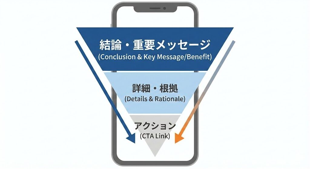 - 逆三角形の構成:最も重要な結論やメリットを冒頭の1〜2画面分に配置する