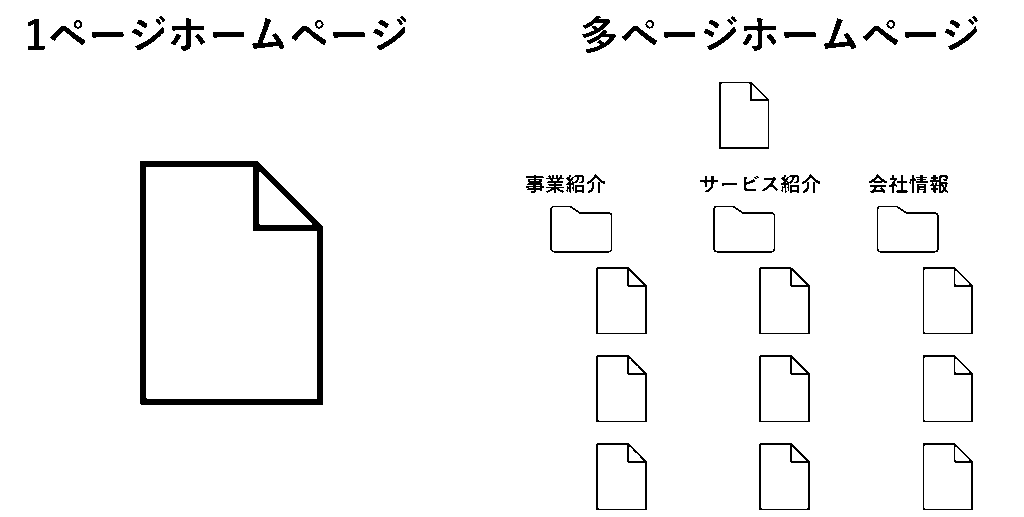 一般的なホームページは、トップページを起点に、事業紹介、サービス詳細、会社情報、採用、実績、ブログなど複数ページで構成されることが多い形式です。これは、企業情報やサービスが複数あり、それぞれに詳しい説明や独立した導線が必要なためです。
