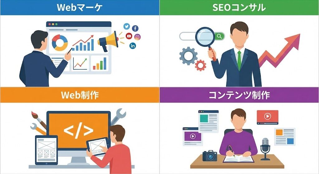 「箱(Webサイト)」を作るプロフェッショナルです。さらに細かく3つに分かれます。