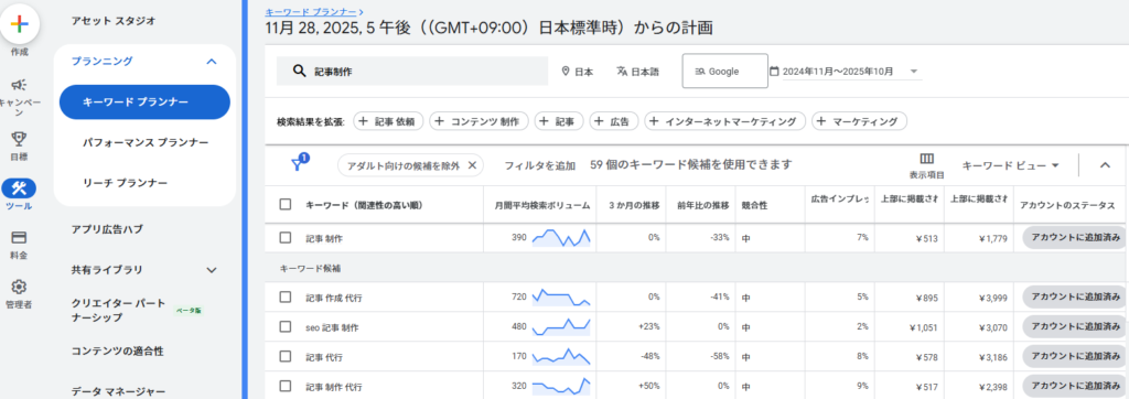 まずはGoogle広告の公式ツール「キーワードプランナー」を使い、狙いたいキーワードの月間検索ボリュームを確認します。 (※本来は広告出稿用のツールですが、SEOの市場調査や競合分析においても標準的に使われています)