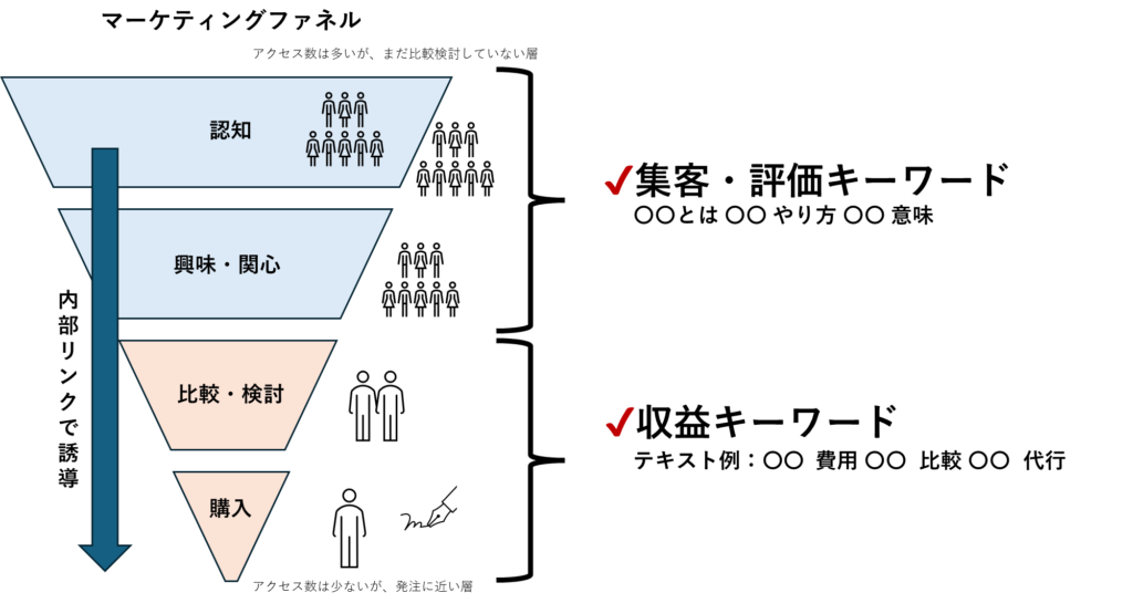 「B(集客記事)」ばかり増やしても売上は立ちませんが、Bがないとサイトのドメインパワーが上がらず、A(収益記事)も上位に行けません。「Bで集めて、Aで刈り取る」という全体設計を持つことが重要です。