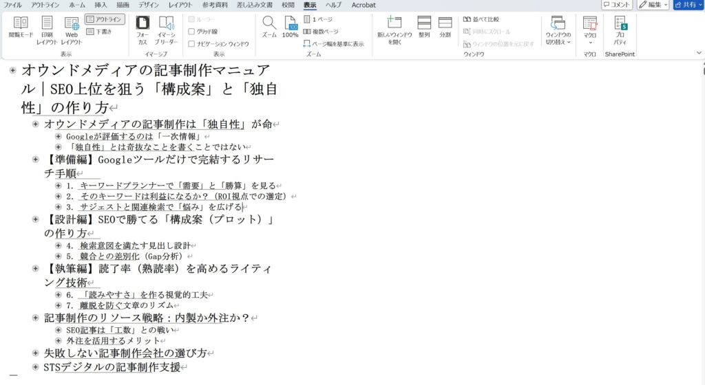 リサーチが終わったら、いきなり書き始めるのではなく、記事の設計図となる「構成案」を作成します。記事制作の成否は、この構成案で9割決まります。