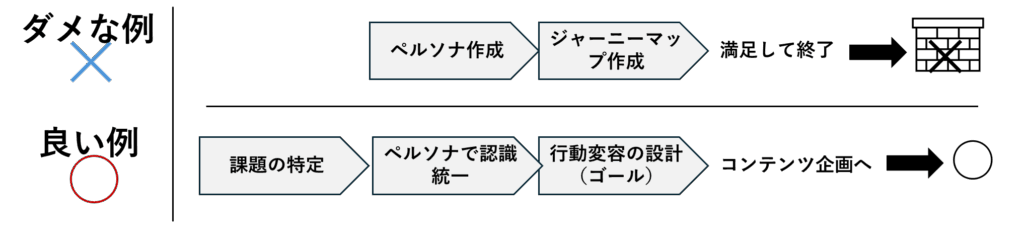 ペルソナシートやカスタマージャーニーマップを作る際、綺麗にまとめることが目的になってはいけません。 この工程のゴールは、「読者の『Before』と『After』を定義すること」です。