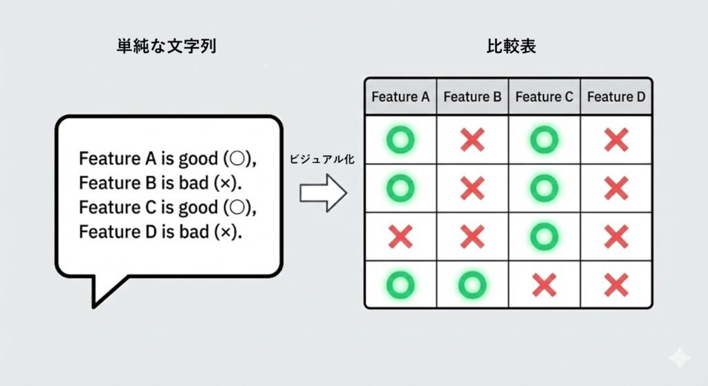 - 〇×比較表: 自社商品と競合A・競合Bを並べ、「価格」「機能」「サポート」などで比較します。全てに「〇」をつける必要はありません。ターゲットが重視する項目(例:価格、手軽さ)で勝っていることを示します。