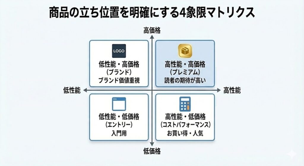 - 4象限マトリクス: 縦軸(価格:高⇔低)、横軸(機能:多⇔少)などでマッピングし、「この商品はここ(コスパ重視ゾーン)にある」と立ち位置を明確にします。