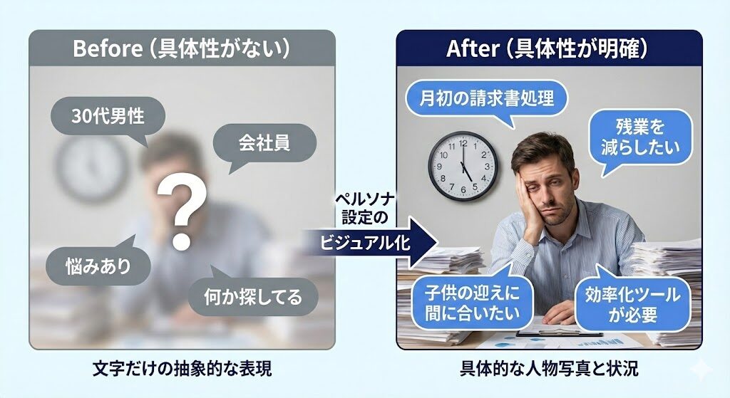 「30代男性、会社員」のような大雑把な属性ではなく、「どんな状況で困っているか(シチュエーション)」を具体的に設定します。