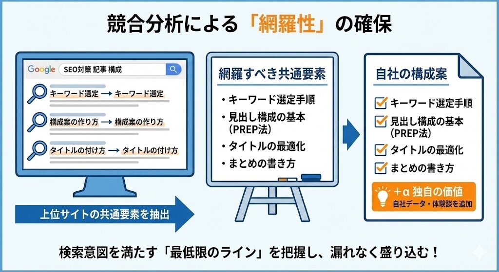 - 独自セクションの配置: 競合が触れていない「自社ならではの視点」を、構成のどの位置(序盤で興味を引くのか、中盤で納得させるのか)に配置するかを戦略的に決めます。